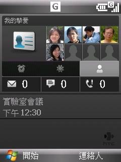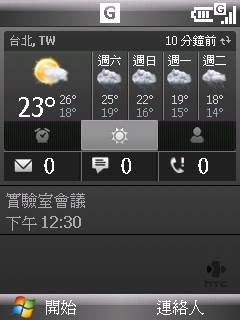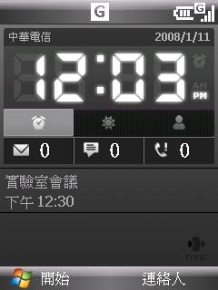 HTC S730 內建了一個新的佈景主題,特別把時鐘部分放大,可以看的很清楚,也可以方便的進入 e-mail 和簡訊畫面。此外還有天氣預報與常用連絡人的功能。 這個佈景主題有很多優點,第一設定鬧鈴變簡單了,只要按一下時間的那個標籤,就可以設定時鐘和鬧鐘;另外提供顯示天氣預報很實用;也有常用連絡人,但這功能要按進去有點麻煩,不如 Windows Mobile 內建的快速撥號來的好用。