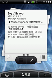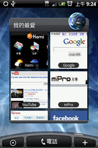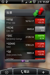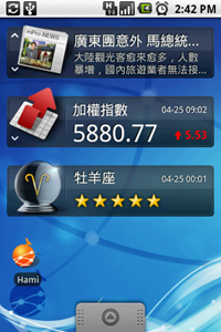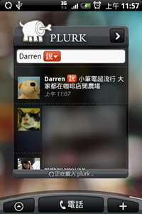 換成 HTC Hero 之後,最常用的天氣和時間結合在一起,變成一個實用又省空間的小工具,另外也多了 GPS 和 Wi-Fi 的快速開關,還有常用的連絡人,這些就是我最需要的功能,都放在最常用的 2 頁上。HTC Hero 總共有 7 頁可以自訂,比原本的 Android 系統多了 4 頁,所以還有空的畫面我就用來放股市、E-mail、我的最愛、Plurk 這些。