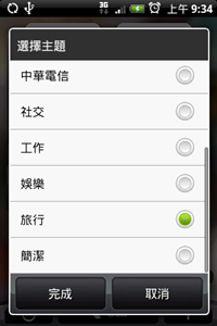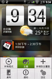 HTC Sense 另外一個特色就是可以像 Winows 系統很輕易得更換佈景主題,平常都是用工作模式,但如果要帶手機出國旅遊的時候,就切換成旅行模式,個人化桌面上就有本地時間和家鄉地的時間、FootPrint 照片、天氣預報、音樂和 Twitter。不用一個一個手動把暫時不需要得刪掉,然後放新的進來。雖然說實話這也不是啥了不起的功能,可是一旦用習慣之後,就很難回去用原本的 Android 了說~