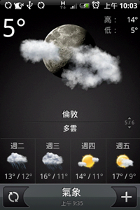 天氣也是漂亮的大圖片,而且和所在位置連接,直接顯示現在所在地的天氣,一樣可以設定接收幾個城市的天氣。時鐘則可以同時看兩個時區的時間: