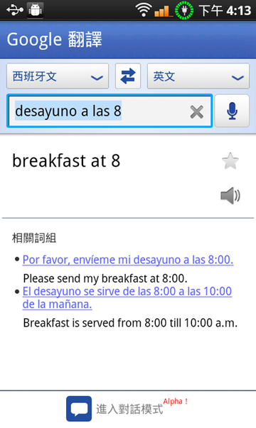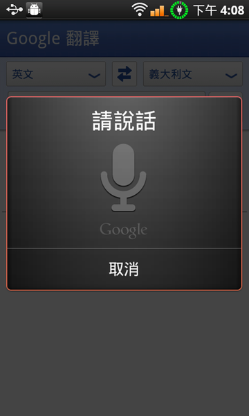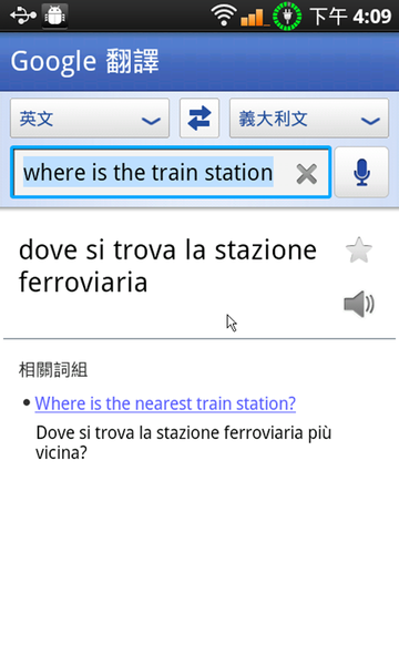 Google 翻譯只要用瀏覽器上網就有,但是 Android 上面的 Google 翻譯不一樣的是:他可以用及時語音翻譯!所以以後出國玩,或者是有外國人來台灣的時候,不管英文法文韓文日文西班牙文義大利文德文,都用說的就可以搞定,意思就是不用浪費時間按鍵盤慢慢查,近乎即時口譯,真的太酷了…