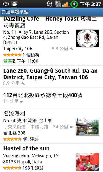 Android 版的 Google 地圖跟 iPhone 比起來多了星號標記的功能,例如說一趟旅行要去好幾個地方,有旅館、好幾個候選餐廳、觀光景點、朋友家、這些地方都可以用在電腦上用 Google 地圖先標示起來,然後自動同步到 Android 手機的 Google 地圖中